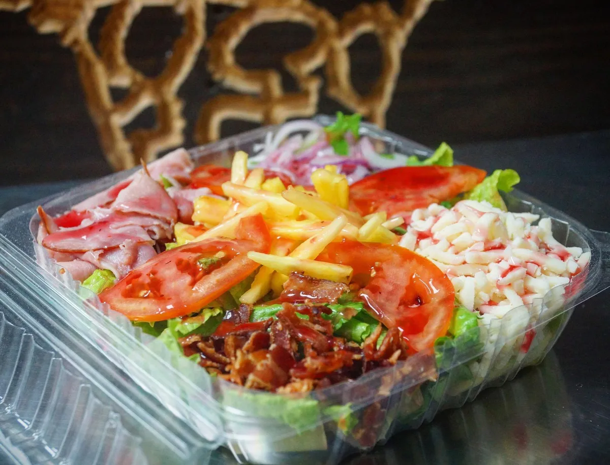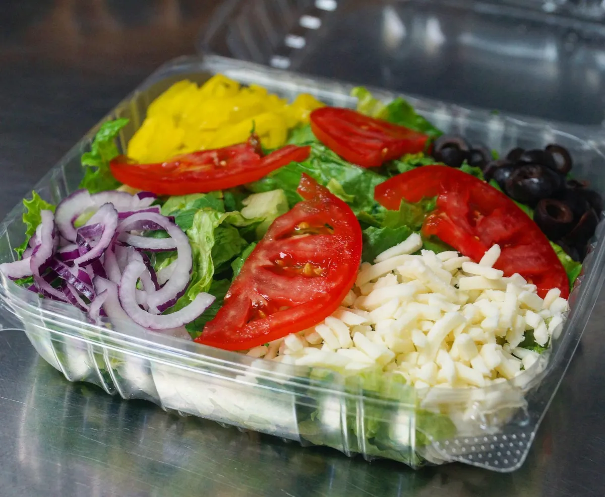 Chopped Romaine Lettuce, Tomato, Banana Peppers, Red Onion, Black Olives, Mozzarella, 1 Packet of Dressing