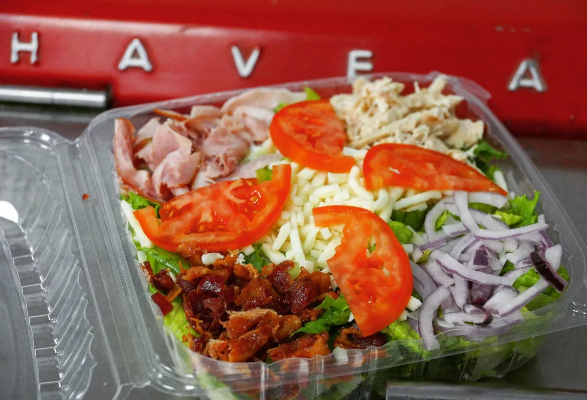 Smoked Bacon, Black Forest Ham, Roasted Chicken, Sliced Tomato,Chopped Romaine with Dressing, Parmigiano Reggiano